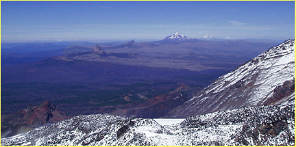 Below are two pictures; the first taken seven years later, in 2010, from high on the Three Sisters. We are looking north, and see the enormous extent of the section of the B&B Fire that burned on the eastern side of the Cascade Crest (and there is much more on the western side of the Crest, also, but not visible in this view)....Also, by looking closer, we can also see (in the mid-foreground) the much older damage of the Big Lake Airstrip Fire of about 1968. The peaks visible on the distant skyline are Mt. St. Helens (barely), Mt. Jefferson (prominent), Mt. Hood and Mt. Adams (dimly seen to the right of Mt. Hood).