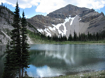 The final CDT image (below) is of Dean Lake. The lake is located at the north end of the Chinese Wall. It's elevation is 7,365 ft, and Pentagon Mtn. above it is 8873 ft. The lake lies a mile or two west of the Continental Divide, and lies within the mountain's east cirque. My maps show that this lake is actually in the headwaters of the middle fork of the Flathead River, which flows north and ends up in the southwest corner of Glacier National Park near famous tourist-trap, Lake McDonald.