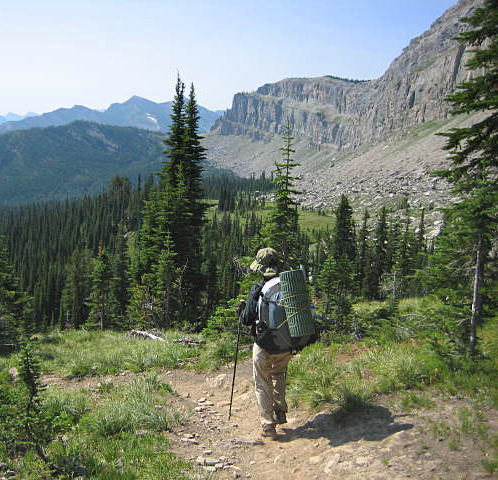All trail pictures on this page are compliments of Basmati from his 2007 CDT hike (except for his self-portrail from 2016).... He describes the scene below, "this is a thru-hiker from Martha's Vineyard threading her way through the meadowed moraines below the Chinese Wall in the heart of the Bob Marshall Wilderness." Most of the Chinese Wall Trail runs between about 7000 and 7400 feet, with the rim above running generally about 8000 to 8300 ft...The Wall is massive and runs for many, many miles. The topo maps show a gentle, sloping west side, and then the steep cliffs breaking eastward, very likely the result of faulting....8576 ft. Cliff Mtn. is probably the highest point of the official, named portion of the Wall.
