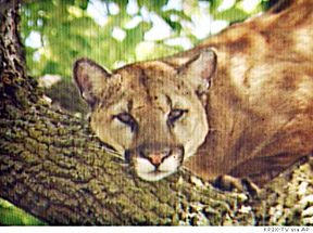* Picture Note: the cougar face shown at page top was a 110 pound male cougar in a tree just blocks from an elementary school in Palo Alto, California on May 17, 2004.... Moments later, it was killed by city Police..Note: Palo Alto is a large city in California.....Credit: the picture was originally taken by an unnamed news cameraman for KPIX-TV.