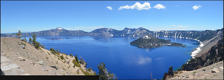 It's Oregon's only National Park. Just a single day spent driving through the Park will stay with you for years. The image below remembers an early fall day when the cold clouds were scudding by, dappling the landscape with warm sunshine despite a very chilling wind. There was a spotlight effect as the sun and shadows raced around the caldera of ancient Mt. Mazama, at one time perhaps the tallest mountain peak in Oregon, now smashed, opened wide, converted from fire into the abobe of 2,000 foot deep crystal waters. It's a high mountain skyscape with a mirror below of amazing azure blue..... Crater Lake, in my book it ranks as one of the wonders of Planet Earth. In the panorama below note the tiny person on the far left side. We're standing at about 7,600 ft. on the western rim of the Lake. Wizard Island is prominent. I highly recommend taking the launch ride around the Lake, and take the boat which drops you off at Wizard Island and lets you explore for a few hours. It's a unique experience. In the picture, note the person in blue pants standing on the far left