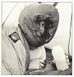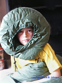 1. SLEEPING BAG HOODS-- the most prominent innovation of a Downhome bag was it's big, fat, free-floating hood (see image at page top). Chuck analyzed the performance of standard sleeping bags and went one BIG step in the Great Unknown. In the general history of sleeping bags, remember that it had been a great leap forward when early designers had dissected the flaws of the old-fashioned flat bags with the square tops and no hood and then created the modern form-fitting "mummy bag" shape with integral hood. Chuck saw that there were problems with the integral hood design-- it doesn't function very efficiently when the sleeper rolls over and buries his face in the hood, breathing moisture into his bag; additionally, cinching up the bag tight enough during really cold winter conditions is problematic, and many sleepers simply feel too clastrophobic to cinch the hood small enough to truly minimize heat loss from the vulnerable head and shoulders area. Some innovative designers have tried to cope with the problem by means of a "down collar" to isolate the leaky hood area from the main portion of the bag, and that, insofar as it goes, is a good solution and works well (I have a very comfortable down collar on my Feathered Friends bag, for example)......But Chuck threw out convention entirely, and chopped off the mummy bag hood, making it a part of the sleeper, rather than a part of the bag! So the hood moves with the sleeper rather than fighting him during the night! Ingenious! And Chuck's hood is not just a parka hood from a typical jacket, it is conceptualized as a piece of equipment with the FULL insulating value of the rest of the bag, be it a winter bag or a summer bag; so his hoods are masterfully crafted with intricate baffling to have the full loft of the bag (in my image, a winter bag hood is shown)....Joke: "How can you tell if you've reached the camp of the DownHome bag owners? Answer:: look for the camp with a bunch of really big-headed people standing around the campfire!"