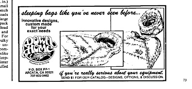 Larry E., catalog illustrator for Chuck, sent me this remembrance: "On your website about old camping gear, the ad on the Downhome sleeping bag page is from my series of illustrations for them in the 70s. I was one of the few working artists in the area and Chuck Kennedy hit on me to illustrate their catalog. And in return, I got the finest sleeping bag ever made. I had to siphon out about a pound of feathers to even approach sleeping in it, and I still have it after all these years, looking brand new. It's been 125 miles on the John Muir Trail and almost countless others, and shows no sign of even been touched, much less trashed around in the wilderness. A Goretex bottom and sides**, I remember they said I wouldn't know if water was under me until I got out of it." (** Goretex did not hit the Industry until 1976-77, so Larry's bag is no older than 1976 or 1977)....