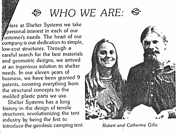 Bob Gillis posts a very interesting and useful history of himself and his company. He is an innovator who actually has spent much of his adult life living in various domes/structures of his own creation-- Gillis reports that he went to JanSport, GERRY and other Colorado companies circa 1975 and was advised to take his backpackable dome prototype to TNF by someone at GERRY. That event, and much more is detailed, including his later work with Bob Swanson, co-founder of Sierra Designs and founder of Walrus... Go to this link (2021): http://www.shelter-systems.com