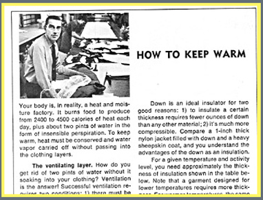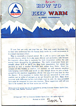 "How to Keep Warm," 1967. "If your feet are cold, put your hat on" was the opening sentence of the small but highly influential booklet. For decades, that proverbial sentence has been drilled into the minds of everyone who takes an outdoor course on winter survival. The 15 page booklet is crammed with other similarly timeless wisdom.. I recommend it highly. (Note: all images on this page are custom creations of OregonPhotos.com and are copyrighted; the original booklet of course continues to be under its own copyright).... The picture below shows Mr. Cunningham in the 1970 GERRY catalog. It's from a page where he discusses in depth "How to Keep Warm." He's probably in his late-forties at the time. This slim booklet and Gerry himself were major influencers of Mr. Jerry Wigutow, the founder of Wiggys in Grand Junction, Colorado.