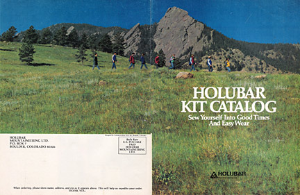 To the left is an image showing the complete front and back cover of the 1978 Holubar Mountaineering Ltd. Kit catalog. Prominent on the skyline are Boulder's famous "Flatirons," a climbing/hiking mecca right in the backyard of the Holubar offices/stores in Boulder. The string of hikers are all Holubar employees! Can anyone identify any of these folks?