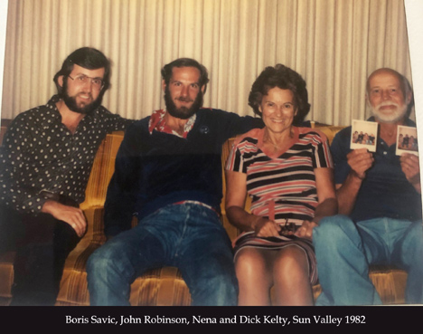 The picture above shows Dick and his wife Nena with two key staff. The picture below shows Dick Kelty in his element, cheerfully helping a group of backpackers! In the background one can see a classic green Kelty frame pack. The picture was taken in 1977 at Lake Arrowhead, California. Bruce Wagner, who was National Sales Manager for Kelty from 1968-1978, supplied this account, "the two young hikers in your 1977 picture of Dick Kelty are Carl Siechert (left) and Norm Switzer. Carl is my brother-in-law. He and Norm and another friend, Bill Berg, were two weeks into a South-to-North thru-hike of the PCT. They were testing equipment for Kelty and, in that capacity, quickly became known on the trail as the "Kelty Kids". On the weekend of April 16-17, 1977, Dick and Nena Kelty came to our home in Lake Arrowhead, California, to intercept the boys for an equipment debriefing. Your picture was actually taken by Bill Berg in the family room of our home."......... Click here for a picture of Mr. Kelty with the founders of Sierra Designs, with whom he sat in about 1979 for a publicity event for "CML" Group.... Mr. Kelty's reputation was sterling, Warmlite's founder Jack Stephenson, who knew him personally, fondly told me, "Dick Kelty was the best-ever innovator and super fair salesman, helpful far beyond any others."