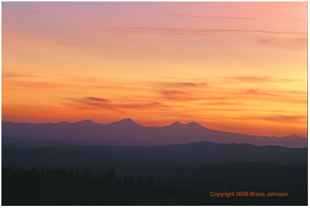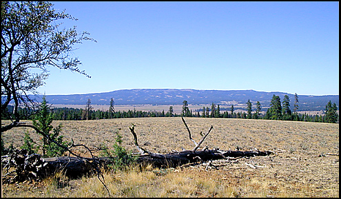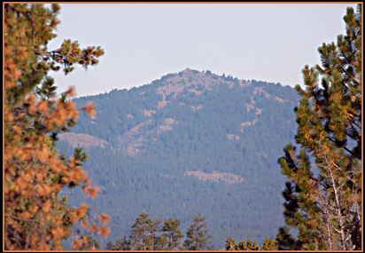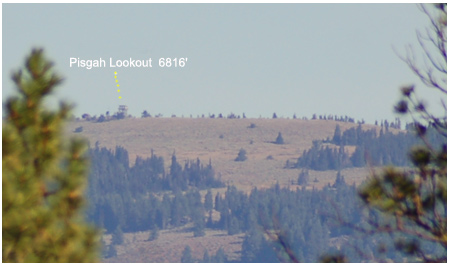 THE MOUNTAINS SURROUNDING OSPWe are standing high at the north edge of OSP. We are at 5,000 feet, looking across the eight mile long sweep of Big Summit Prarie at 4500 feet. The long mass of Mt. Pisgah lies at a distance of about 12 miles. Pisgah is one of what I call the "nearly 7000 footers," a grouping of peaks that cluster around our OSP site to the west, north and east (the four are Lookout, Round Mtn, Pisgah, and Spanish Peak)..Pisgah's ultimate summit, with the lookout atop it, lies at about 6,830 feet.
