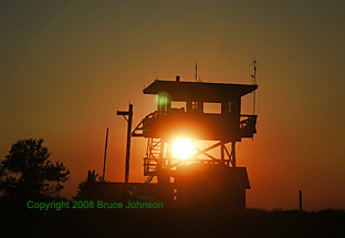 If one were circumnavigate the ridgelines around the headwaters of Bridge Creek, the trip is a bit over 9 miles of cross-country hiking. The terrain is somewhat more forested than Lookout Mtn.'s summit area, but still interesting and varied between forests and open areas. ... If windy on the ridges, you can always find shelter by skiing down into the canyons. Bridge Creek in particular, on the north, offers something close to 400 feet of descent before the forest closes in too much to be pleasant and the canyon steepens too much. Bridge Creek and its associated perennial springs provide the domestic water supply for the town of Mitchell, elev. 2760, far below alongside Hwy 26. The highest reaches of Bridge Creek also shelter one of Oregon's smallest and newest Wilderness Areas, that being the Bridge Creek Wilderness, 5400 acres, established in 1984. Below are two pictures of the beautiful Pisgah lookout tower, one from right beside it with much smoke from 2003's B&B Complex Fire mucking things up, and the second a picture taken from 12 miles away, down at OSP.