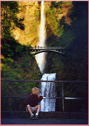 Multnomah Falls is comprised of an upper and lowers falls, just like its cousin far to the south, Yosemite Falls. Nearby to this thundering Oregon waterfall are Portland, Interstate 84, Bonneville Dam, Rooster Rock State Park, Crown Point Gorge Overlook, and Cascade Locks with its magnificent Bridge of the Gods (make the sidetrip to cross over the Bridge even if you don't plan on touring the Washington side as the tollbridge fee is small, and the gawking even better the second time across the bridge!). Bring a raincoat or umbrella to any of these areas in the western portion of the Columbia River Gorge, as they all get copious rainfall and can be subject to very strong east or west winds.
