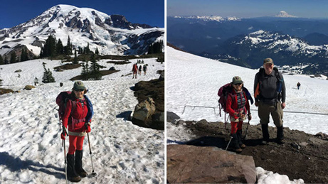 Mt. Rainier, 14,410 ft. It's the most heavily-glaciated mountain outside of Alaska. HERE IS AN AWESOME SPEED RECORD SET BY A SENIOR, WHO IS ALSO A WOMAN. Bronka Sundstrom, age 77, climbed Rainier by the normal route, but did not climb it the usual way wherein climbers start from 10,100 ft. Camp Muir. .. Incredibly, this very tiny survivor of WW II Death Camps climbed it up and back in one 18 hr. day from Paradise Inn, "the parking lot," at 5400 ft. And in 2016, at age 91, she was back again, succeeding in climbing up to Camp Muir! (see pictures below)