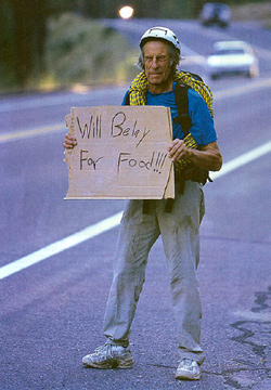 he's holding a hand-lettered sign: "Will belay for food."