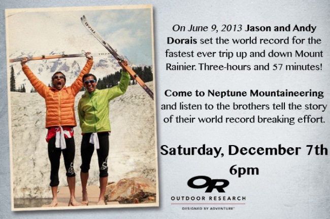 Finally, here is a new speed record in the realm of mountaineering; Mt. Rainier at 14,410 ft. is the Northwest's highest peak, and nurses the largest glacier system in the Lower 48 States. The Dorais brothers' climb began at just 5,400 feet near Paradise Lodge (do the math, that is 9,000 feet of vertical) :