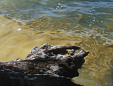 Near our campground, Paulina Lake was clear and fish drifting ten feet deep were visible with great clarity. But over on the northeastern shore of the big lake, prevailing winds had piled up strange gunky wads of pollen and algae in some very psychedelic ways.