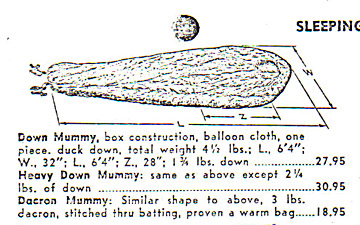 Sleeping Bags: are still pretty primitive. The lightest shell material is not modern ripstop or taffetta nylon, but the old war-surplus-type "Balloon cloth" that Alice Holubar had begun using shortly after WW II. Bag shape and features are still very unrefined and not very comfortable. No nylon zippers or cord-locks! The insulation choices are down, or an early synthetic called dacron. Prices are astoundingly low by today's standards.