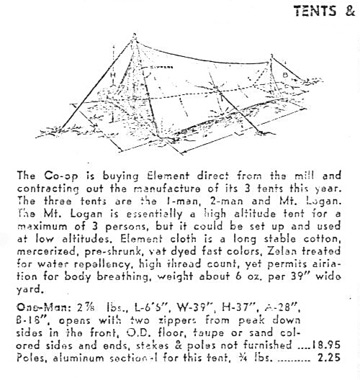 Click here to see an image of the ultimate evolution of the A-frame style tent, a great example of which was the REI Denali Expedition, circa 1975. Far stronger and more evolved than the 1957-era A-frames, but destined nevertheless to be rendered extinct by the next generation of tent designs.