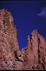 Smith Rock climbing area is tucked away about five miles east of the main highway through Central Oregon, which is Hwy 97. This climber's paradise is around 25 miles north of Bend. Its geology is very volcanic, from about 28 million years ago and again 400,000 year ago from Newberry Crater; rhyolite and tuff rocks predominate. Notable routes and trails include: the infamous Monkey Face, Morning Glory Wall, Mesa Verde Wall, Wombat, The Monument, Shiprock, Cathedral Rock, Koala Rock, Opposum, First Kiss, the Marsupials, Misery Ridge, among zillions of other routes. Don't neglect the huckleberry ice cream at the rustic Juniper Junction near the Park's entrance. And in nearby Terrebonne there's well-stocked Redpoint Climbers Supply, on the east side of the highway. And for belly-filling food, there's Base Camp Pizza nearby.