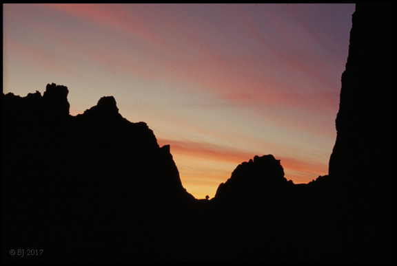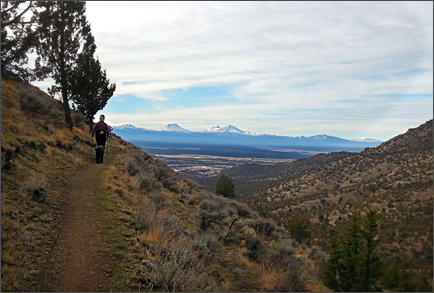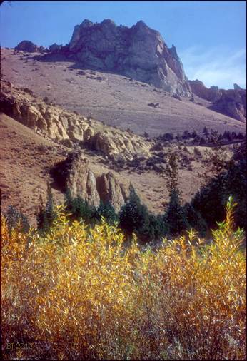 Ah, for those good 'ole days when Park regulations were few. Here I was camped beside the Crooked River at the north end of the Park. There are willows and Ponderosa pines along the water's edge, and lots of quiet in this early October shot. Above looms The Wombat. The slash across the hillside is what is called the Burma Road. It services both ends of a 3500 ft. long tunnel that carries the irrigation water of the "Central Oregon Canal." The tunnel and canal were built "by 1907" according to the website of the Central Oregon Irrigation District. The canal begins in Bend where Deschutes River water is diverted, and ultimately goes all the way into the Madras area; the canal and its sister canal the "Pilot Butte Canal" are the absolute lifeblood of all those green fields one sees in Central Oregon-- before 1900, everything was desert. Below: hiking into Smith Rock from the north on the Gray Butte trail.