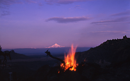 Image above: sunrise from Misery Ridge. Oregon's second-highest peak, Mt. Jefferson shines in the dawn light. All the major Cascade peaks from Mt. Hood to the Three Sisters and Mt. Bachelor are spectacularly visible from the ridgetop trails at Smith Rock... Picture note: image is from long, long ago, before current strict State Park regulations about such things. The 652 acre Park itself was formed by land acquisitions between 1960 and 1975, so it's possible that my campsite was not even in the Park at the time... Also, in my defense, this was winter and fire danger was very low. The Park is open year-round due to its very dry climate, but be aware that winter can be very cold, with occasional cold waves where temps can go well below zero (F). Camping is allowed in a climbers "Bivouac" area for a very modest fee. Image below: This spectacular area has occasionally been used in location shots for films, most notably in the 2014 film "Wild," starring Reese Withspoon, one of my absolute favorite inspirational films. There she is, with her infamous pack named "Monster." In the film, she and her crew actually hike down the steep trail to the Crooked River, cross it, and shoot a scene under the cliffs on the other side, at a spot that I myself am very familiar with.