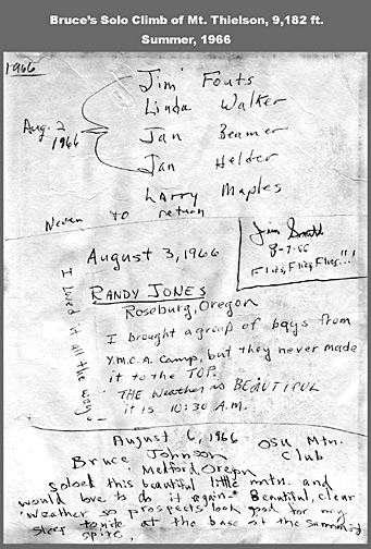 These priceless little books are periodically collected and brought down to civilization to be archived at Mazamas headquarters* in Portland, so beware, what you write up there during the haze of fatigue and altitude may come back to haunt you! * The big white building is located at 43rd and Stark in SE Portland. The records are stored along with other endurinjg treasures in a very large climate-controlled room, a part of the main Mazamas Library. Access would be upon special request. When I searched in the Mt. Thielson records, I found my best friend's words from the register up on Mt. Thielson in 1964 and '65. What a memory-trip that was! Later, my friend at the Mazamas Library found my own entry from summer 1966 (see image to left; my entry is on the lower part of the page)....Mt. Thielson can be seen in the picture at the top of the page-- it's the pointy, very prominent peak on the right side of the picture.