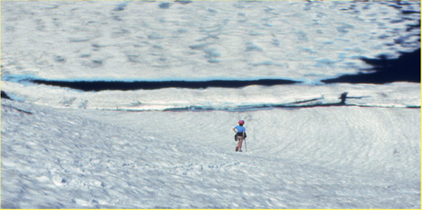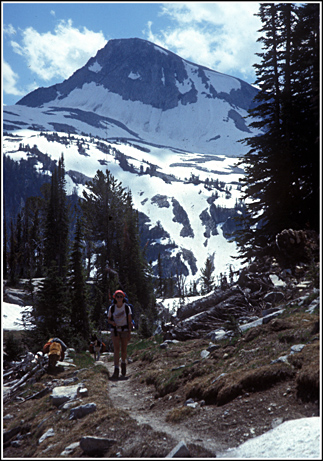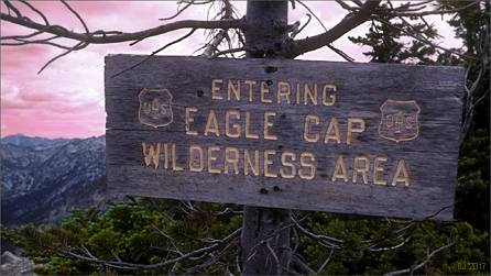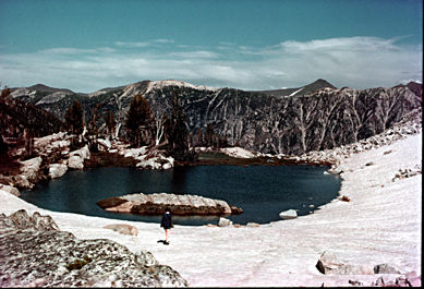 The pictures: top is an entry sign to the Wilderness, established 1964, currently at 355,000 acres in size. Next is entering the Lakes Basin with Eagle Cap dominating. Next is a nameless tarn at 8354 ft. on the Hurwal Divide 0.4 air miles up above Razz Lake (8110 ft, a steep climb to the tarn!). Last is a hiker coming down off a climb of Eagle Cap, skirting the shore of still-mostly-frozen Glacier Lake (8184 ft) in late July.
