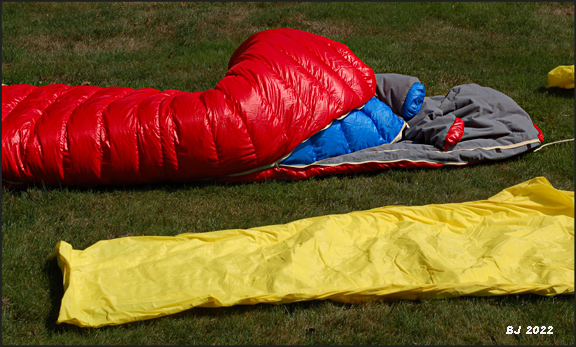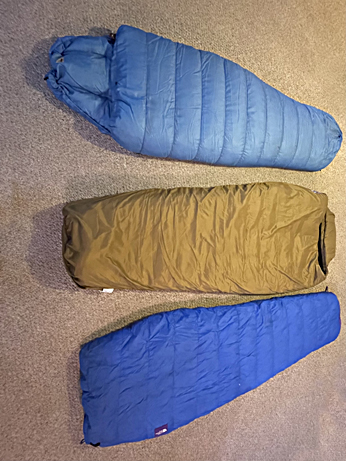 The picture (below) shows a Stephensons Warmlite "Triple Bag," their signature bag model. It comes with two separate zip-on-zip-off down tops; when used with both tops it's rated to about 30 below zero. I formerly owned a Warmlite Triple Bag myself. Below: a Warmlite "Triple" down bag with Red Top, Blue top, gray vapor barrier liner....The yellow object is the DAM-- it's a 4 inch thick "down-filled-air-mattress."