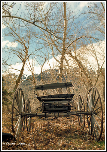 Nearby rests the horse-drawn buggy that transported the isolated farmers to destinations where they sought conviviality and laughter. They could travel south to the schoolhouse in Andrews, or they could set their sights north to the Whitehorse Ranch on the shores of the Alvord Desert. The scene in the 1990's is sad; the buggy is parked probably forever in this quiet aspen grove. Time has left it lonely. Picture by Roger M. Johnson.