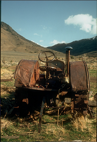 On the remote eastern side of Steens Mountain, five thousand feet below the head of Wildhorse Canyon, is farmland, or at least these evidences of someone's fantasy that this arid but magnificent land might thrive. Although one can imagine the din this iron-tired beast might have made on the land, now, at the new millenium, the silence in this land is so deep it is deeply unsettling. The nearest real town is over 100 miles distant.