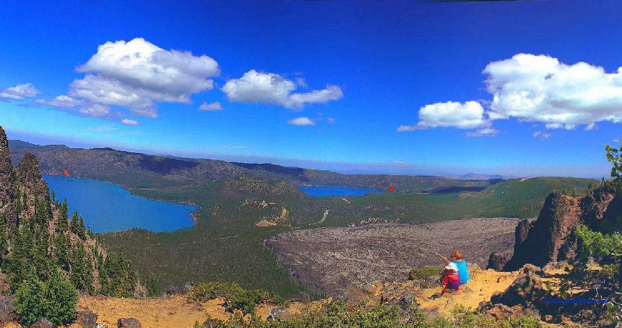 Located some forty miles south of Bend, this is Oregon's "Other Crater Lake." Ancient Mt. Newberry was a big, sloppy shield volcano much like Mauna Loa in Hawaii, with about 400 cinder cones scattered like hot candy around its spacious flanks. It was at least as high as Mt. Hood in its heyday, but then it collapsed upon itself several times over the millenia. There was probably a time when its caldera was filled with a mighty lake like Crater Lake, and geologists believe it was probably a deep one that was about 1,600 feet deep; however, today, continued volcanic activity has left us with two separate lakes, Paulina Lake at 250 feet deep, and East Lake at 170 feet deep. Since the area is located east of Cascade crest, it is a lot drier than the Cascades to the west, and the vegetation is characterized more by various pines than by Douglas or true firs. Paulina Lake on the left is just under 6,400 ft in elevation. East Lake on the right is slightly higher and still sports some hot springs seeping into it on its SE side; it has no outlet stream or river....East Lake Hot Springs Resort flourished from about 1915 to 1941; in the 1920's patrons from many States outside Oregon came to sample its 120 degree mineralized waters (location of resort was the Red "X" on the right-most lake in the image above)...... Paulina Lake has a user-friendly hot springs area on its NE shore (see Red "X" on the shore of the left-most lake in image above, and then see image of the hot springs below)...... Obsidian Lava Flow is one of the 2 or 3 most recently volcanic areas in Oregon at only 1,300 years in age. It is the large dark feature just over the people's heads. Even more interestingly, this lava flow was a training ground for NASA Astronauts during the early days of the U.S. Space Program!