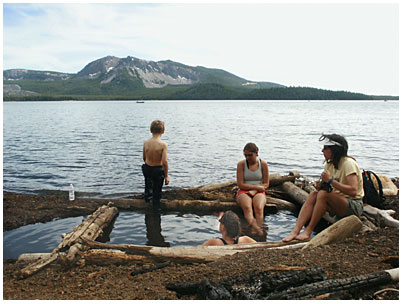 The hot springs which ooze into both Paulina and East Lakes are full of minerals and heat, which are thought to cause the phenomenal growth rates of fish in these lakes, eg. where 3-4 inch fish which are released into the lakes will reach a length of 10-12 inches in just one year. Thus the superb trophy fishing in these lakes. The fishes found include Kokanee salmon, brown, rainbow and brook trout. Recently, in 1990, Atlantic salmon were released into East Lake...... Interestingly, early explorers of the area found both lakes devoid of fish, which is thought to be caused by the waterfalls on Paulina Creek just below the outlet. Thus, the active Native American cultures which inhabited the Crater for thousands of years apparently did so without the benefit of fishing, which would have been a major addition to their diets. The lakes were first planted with fish in 1912...... Other Oregon Hot springs include-- Bagby, Austin, Bigelow, Terwilliger aka Cougar hot springs (French Pete),Wall Creek, McCredie, Umpqua, Hart Mountain, Mickey (probably unsafe now), Alvord, Whitehorse, Blue Mountain hot springs (probably back in operation after a lapse), Snively, Breitenbush hot springs, Belknap, Kah-Nee-Ta hot springs, Ritter, Lehman Hot Springs where my Dad used to soak after elk-hunting, the recently magnificently refurbished Hot Lake Resort (Hot Lake) near LaGrande), Cove Pool, Summer Lake Resort, Hunters near Lakeview can include a real geyser in their hunt, Crystal Crane (Harney County).