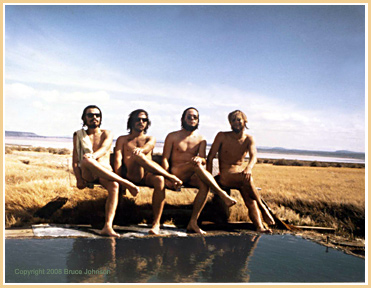 Oregon is a State blessed with a great variety of natural geothermal features like hot springs. The Steens Hot Springs is a primitive bathing site in one of the most exotic and unusual locations in Oregon. It sits right on the edge of the Alvord Desert salt flats where land speed records have been set (see main Steens page for details). The picture looks east, across the Alvord Desert and toward the distant Owyhee River canyon country....In the other opposite direction, the vast eastern scarp of the main Steens Mountain vaults into the air, rising well over a mile above the springs within just a few miles. The springs are a site often wracked with powerful winds, but just bury yourself in the warm waters to escape the chill! My friends and I posed on the bench in 1972; just the day before, we had been skiing up in the high canyons of the Wildhorse.